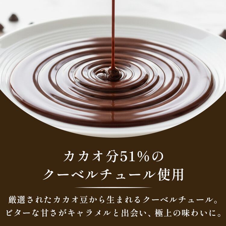 厳選されたクーベルチュールチョコレートを職人の手仕事でキャラメルと合わせ、 深みのあるリッチな味わいに仕立てました